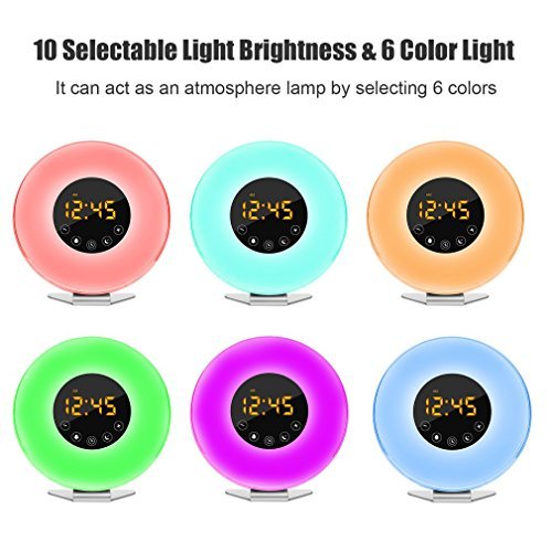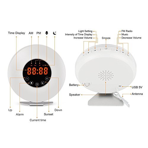 - ⏰ [SUNRISE & SUNSET SIMULATION] 30 minutes light up before your alarm time. Sunrise function light gradually brighten from 10% of brightness to 100% till wake up from deep sleep gently. sunset sleep light can be selected 15/30/60 minutes period, guiding you to natural and restful sleep. When you turn on the FM radio, the volume of radio will be gradually fade out untill shuts off at sunset time.