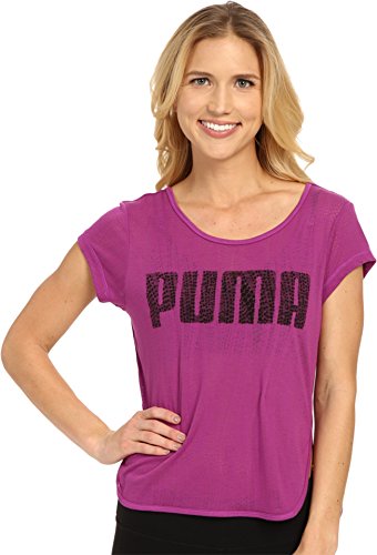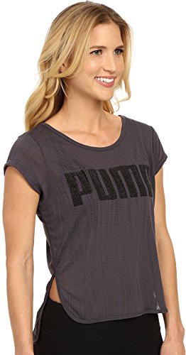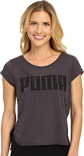 Perforated overlay adds texture and a visual appeal to this top. Scoop neckline. Short sleeves. Split hemline drops at back. Brand mark logo spans across chest. 53% polyester, 47% viscose. Machine wash and dry. Imported.