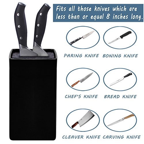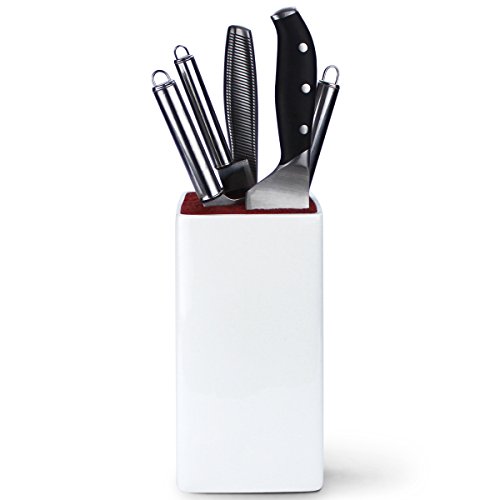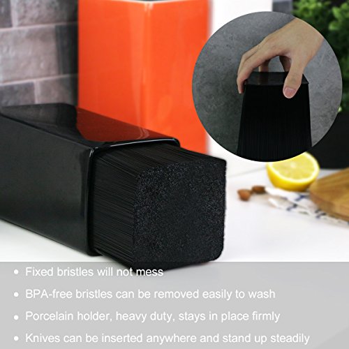 -. Feature : ★HIGHLY PRACTICAL - The universal ceramic knife block helps to organize mixed cutlery and knives, and securely hold knives in place. Well wrapped in a box, ideal for a gift. / ★INNOVATIVE DESIGNED - The interior is made of BPA-free bristles, easily remove to clean without making a mess. The bristles help to maintain blade sharpness and prevent dulling. / ★PORCELAIN HOLDER - The exterior is made of hard-paste porcelain, harder than stoneware. Heavier than wood, it stays firmly in a place without sliding. Dishwasher safe. / ★MAGNETIC BRISTLES - The magnetic bristles make knives to be inserted anywhere and stand up steadily. A standalone knife storage to any kitchen. / ★FITS MOST KNIVES - With an overall dimensions of 8" x 4" that fits any types of knives and fits blades up to 8" in length.