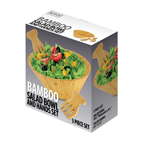 The KOVOT Bamboo Bowl and Salad Hands Set will make a beautiful and elegant addition to any home. The set includes a large bamboo salad serving bowl as well as a pair of salad serving hands. This bowl is made from high quality bamboo for the most natural, yet durable feel. The color has not been tainted with any stain, it remains the natural color of bamboo, so product may appear slightly different than in the listing images. The ideal use for this bowl is to serve a beautiful green salad or some fresh summer fruit, but can be used for many other things. Wipe clean with mild soap and water and dry thoroughly for longest life. Bowl measures 5″ Tall x 10 1/2″ Wide x 10 1/2″ Long. Salad hands measure 6 1/2″ Long and 3 1/2″ WideFeature