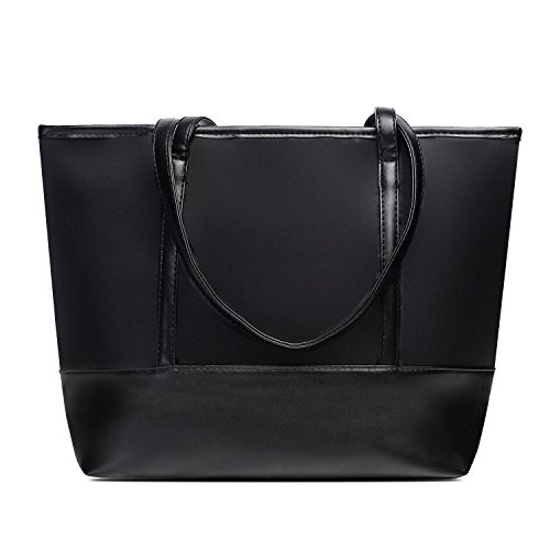 POCKET:Zipper top closure. There are 2 patch pocket,1 zipper pocket and 1 internal independent barrier.This large tote can accommodate 13" laptop,iPad, cosmetics, cellphone, charger, water bottle, wallet, lunch box and other daily necessaries.All stuff can be well organized inside.Large capacity and durable for travel,business,work,school,leisure and daily life.