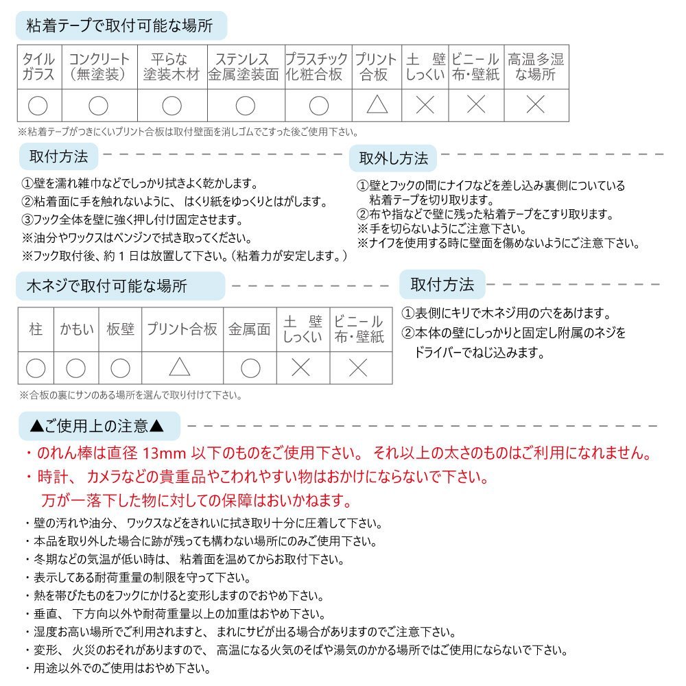 Material: ABS resin (main body), thermoplastic elastomer (catch parts), steel wire (wood screw)