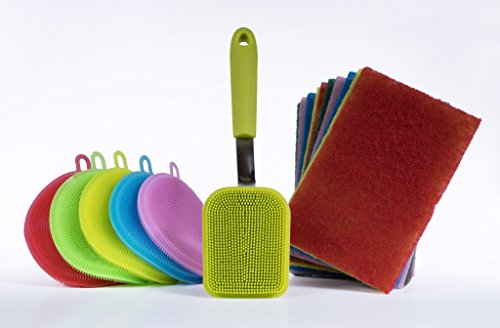 ✅ BEST VALUE SET-16 PCS: The package includes 5 colorful antibacterial silicone scrubbers, 10 scouring pads and a long antibacterial handle silicone brush.