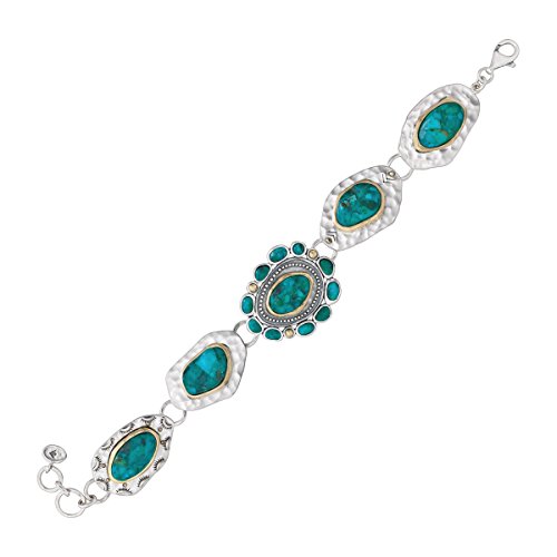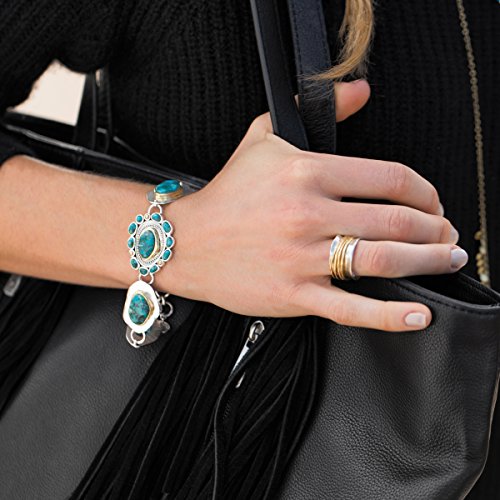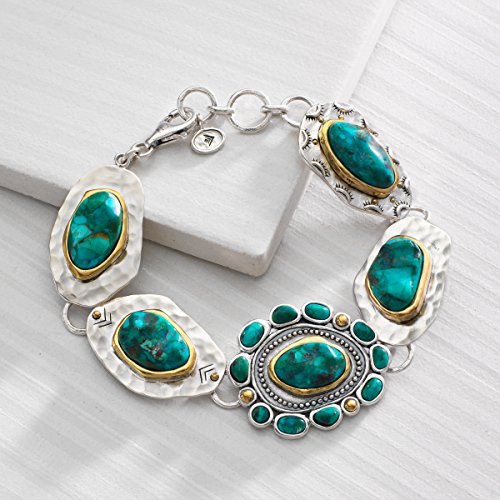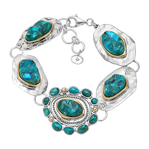 -. Feature : New Mexico is calling with the Santa Fe bracelet, featuring turquoise stones, totaling 54 1/3 ct, lined with brass on hammered sterling silver plates / THE NEW WEST: With a bold gemstone like turquoise, you're sure to find the perfect piece to complement your plaid, suede and chambray staples. Southwestern inspired jewelry can be categorized by its Navajo or Native American patterns, fringes, tassels, warm and earthy colors and its use of materials like leather and calf hair. / TURQUOISE: Pressure-impregnated with acrylics/resins to increase strength and enhance color, it is no wonder this stone has the high value & desirability that it does / POLISHED-FINISH STERLING SILVER: Pieces featuring a polished-finish are perfect for those who want their jewelry noticed, making them perfect go-to pieces for a fancy event or a night out on the town; this polished-finish piece comes with a ".925" sterling silver stamp as a symbol of guaranteed product quality / Bracelet measures 8 inches in length and 1 1/8 inches in width, finished with a lobster clasp