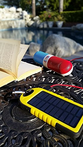 -. Feature : High capacity rechargeable lithium ion polymer battery pack allows 2 charges to the average cell phone. High capacity output enables simultaneous charging of 2 devices by dual USB ports. / Charge Solex solar charger via standard wall charger or by solar! / Materials included: Solex external battery, charging cable, carabiner / Red, water-proof, dust-proof, shockproof design. Compact and stylish, clip to your back-pack with included carabiner to charge in the sun while you travel or play. / Integrated LED flashlight lights up the dark! Press power button twice to turn on LED. Press power button once to observe charge level and enable charging of your device. Left charge status LED lights up green when sufficient sunlight falls on solar panel to charge device.