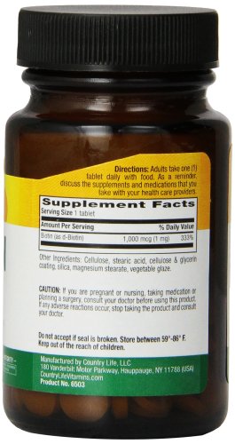 -. Binding : Health and Beauty -. Brand : Country Life -. Color : Parent -. IsAdultProduct : 0 -. Label : COUNTRY LIFE -. Manufacturer : COUNTRY LIFE -. PackageQuantity : 1 -. ProductGroup : Health and Beauty -. ProductTypeName : HEALTH_PERSONAL_CARE -. Publisher : COUNTRY LIFE -. Studio : COUNTRY LIFE -. Title : High Potancy Biotin 5 mg by Country Life