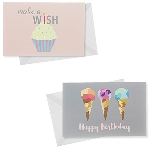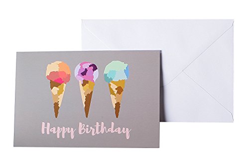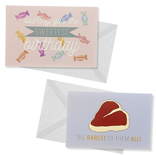 -. Feature : 48 pack of Happy Birthday greeting cards in 6 fresh and attractive designs - cupcake, steak, beer, ice cream, and bacon. / Contains 24 greeting cards with birthday sentiments and 24 blank cards for your custom messages. / Each card is printed on high-quality card stock for elegance and extra durability. / Ensure you always have greeting cards on hand for when occasions arise throughout the year. / Each card measures 4 x 6 inches. Includes 48 corresponding envelopes. Simply moisten to activate seal adhesive.