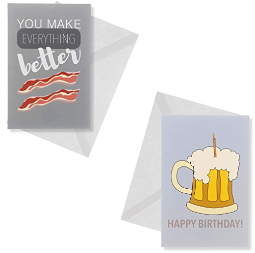 This assorted pack of 48 birthday greeting cards will prepare you for all your card-sending needs! Cut the hassle of rushing to the store and overpaying for cards. This pack consists of 24 greeting cards with birthday sentiments and 24 blank cards to include your very own custom messages. Each card features one of 6 fresh and attractive designs - cupcake, steak, beer, ice cream, and bacon. Make a statement with these birthday cards made of high-quality card stock that feels thick and sturdy. Each card measures at 4 x 6 inches and comes with corresponding envelopes. Ensure you have plenty of greeting cards on hand for when occasions arise.