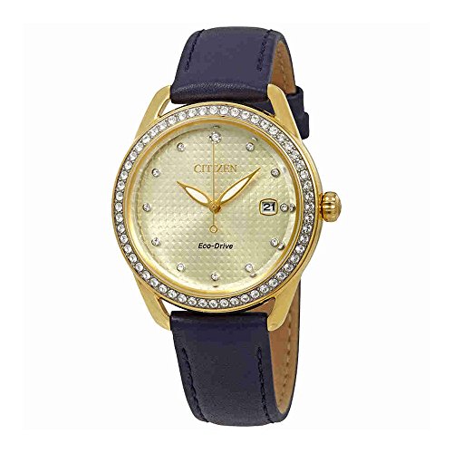 Additionally, Eco-Drive technology allows your timepiece to charge in any light, eliminating the need for a battery.37mm gold-tone stainless steel caseMineral CrystalJapanese Quartz movement/ Eco-Drive, Never needs a battery, Charges in natural or artificial lightChampagne-tone textured dial with gold-tone hands and Swarovski crystal numerals 3-hands and date windowSplash resistantNavy blue leather strap with fold over clasp with buckleCitizen Drive Style#: FE6112-09P