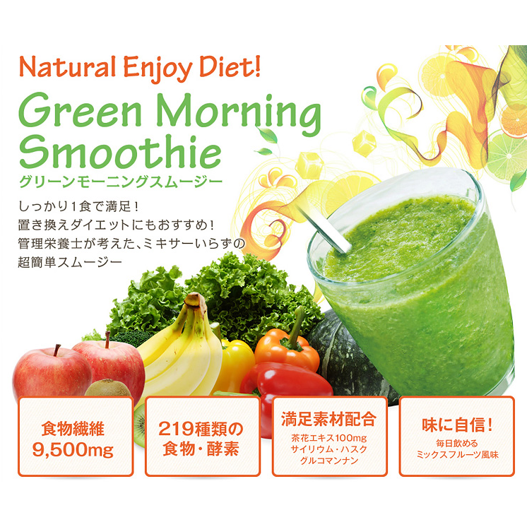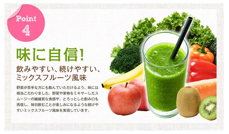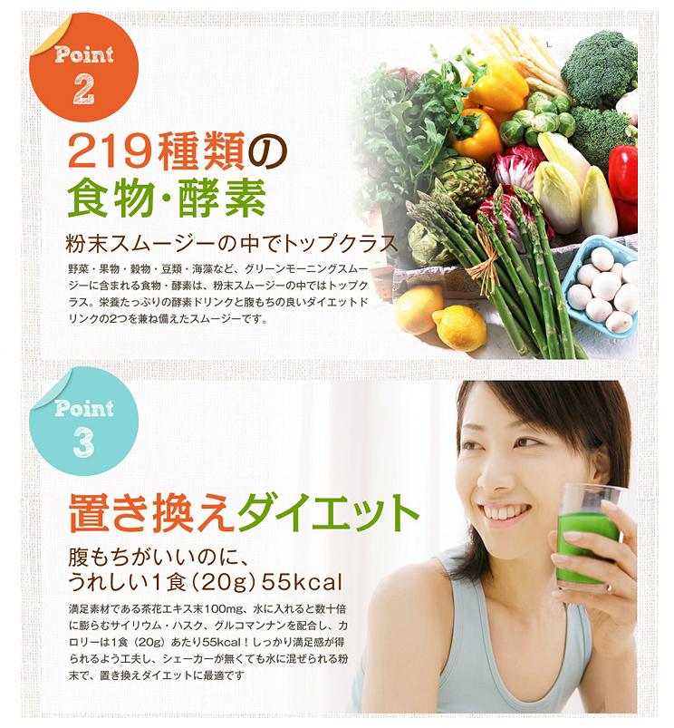 水溶性食物繊維、デキストリン、大麦若葉末、大豆たんぱく、濃縮植物酵素(米コウジ、ハトムギ、リンゴ、パイナップル、ブドウ果皮・種子、バナナ、玉ネギ、キウイ、キャベツ、カボチャ、トマト、人参、ピーマン、ブロッコリー、オレンジ、大根、ザクロ果汁、玄米、舞茸、乾椎茸、ローズヒップ、ウコン、大麦、シナモン、ユズ、生姜、田七人参、ナツメ、モロヘイヤ、明日葉、甘藷、山芋、大豆、モチキビ、モチアワ、ヒエ、丸麦、タカキビ、赤米、赤モチ米、黒モチ米、緑米、ハルウコン、ガジュツ、ササゲ、黒豆)、サイリウム・ハスク、茶花エキス末、果汁パウダー(デキストリン、オレンジ濃縮果汁、ブドウ濃縮果汁、リンゴ濃縮果汁、砂糖、温州みかん濃縮果汁、ブルーベリー濃縮果汁、ピーチ濃縮果汁、分岐オリゴ糖)、グルコマンナン、植物発酵物乾燥粉末(デキストリン、黒糖、果実・野菜(オレンジ、パイナップル、バナナ、リンゴ、パパイア、グァバ、人参、キウイ、その他)、野草エキス(パフィア、ローズマリー、カツアバ、紫イぺ、キャッツクロー、その他)、穀物(玄米、インゲン豆、トウモロコシ、オーツ麦、大麦、エンドウ豆、カシューナッツ、黒ゴマ、キビ、大豆、ライ麦、その他)、海藻(わかめ、昆布、海苔)、ハチミツ)、植物発酵食品(デキストリン、てんさい糖、黒糖、麦芽糖、ヨモギ、ウコン、どくだみ、キダチアロエ、高麗人参、大豆、バナナ、山芋、リンゴ、その他)、植物発酵エキス(糖類、果実類、野菜類、野草類、豆類、きのこ類、海藻類、穀類)、バナナピューレ、野草発酵エキス(オリゴ糖、砂糖、てんさい糖、ヨモギ、その他)、増粘多糖類、酸味料、貝カルシウム、香料、酸化マグネシウム、甘味料(アスパルテーム・L-フェニルアラニン化合物、アセスルファムカリウム)、ビタミンC、ピロリン酸鉄、抽出ビタミンE、ナイアシン、パントテン酸カルシウム、ビタミンB1、ビタミンB6、ビタミンB2、ビタミンA、葉酸、ビタミンD、ビタミンB12