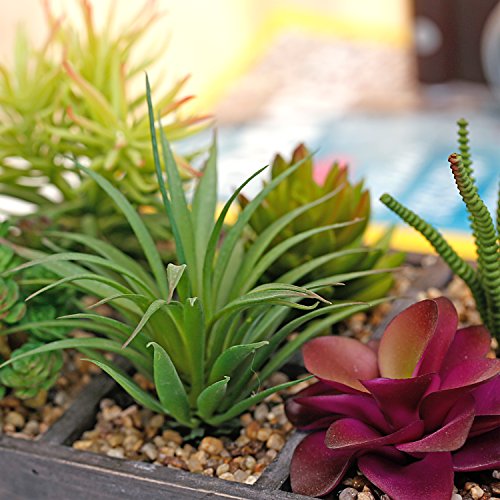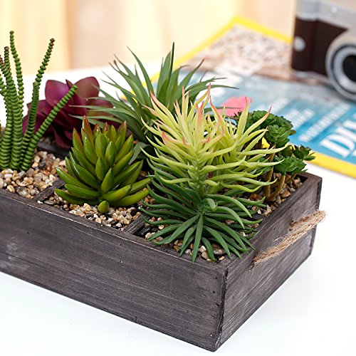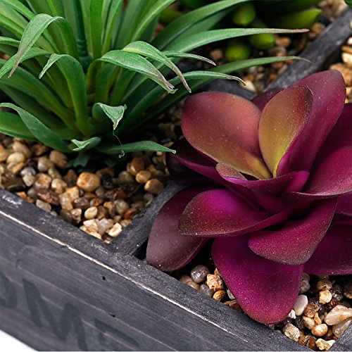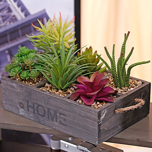 Create an oasis on any counter top, desk, table or centerpiece with this rectangular wooden planter box and faux succulent plants. Showcases 6 different succulent plants in a variety of colors, giving a unique variation to each compartment. Natural colored pebbles have been placed in the bottom of each plant to create a more realistic look. Features twisted rope handles and the word 'HOME' stenciled onto the front of the planter in thick black letters. Any where you place this rustic planter box and variety of artificial succulents, it's sure to brighten up the space with its realistic lush greenery.**Official MyGift® product.**