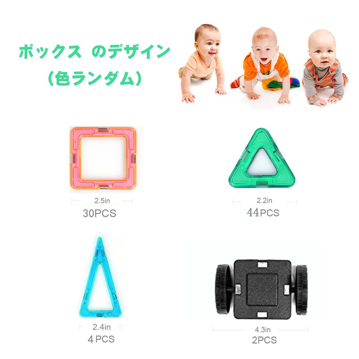 ★カラー:マルチカラー(ランダム送信)正方形 x 30個、三角形x 44個 長三角形x 4個 車輪 x 2セット 説明書x 1冊