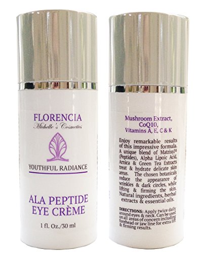 [Product Information]- Enjoy remarkable results of this impressive formula. Matrixyl® (Peptides), Co-Q 10, Mushroom Extract, Alpha Lipoic Acid, Vitamin K, Arnica Extracts. Unique Eye Cream by Florencia treats & hydrates delicate skin, helps reduce the appearance of wrinkles & dark circles, while lifting & firming the skin. Natural ingredients, herbal extracts & essential oils. Natural color, natural scent.
