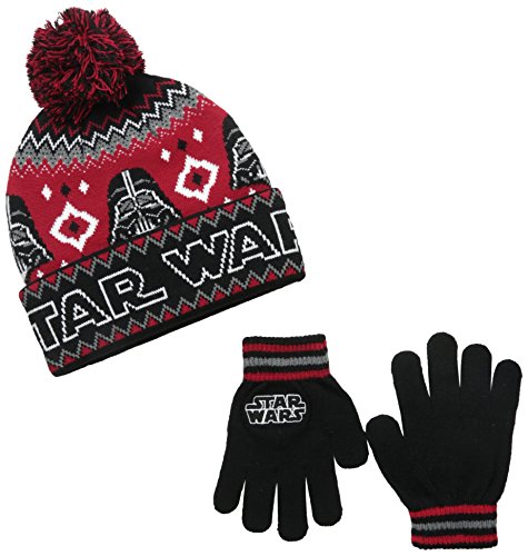 - Two-piece hat and gloves set includes gloves with Star Wars logo applique and hat with knit Star Wars and Darth Vader images, top pom, and rolled cuff