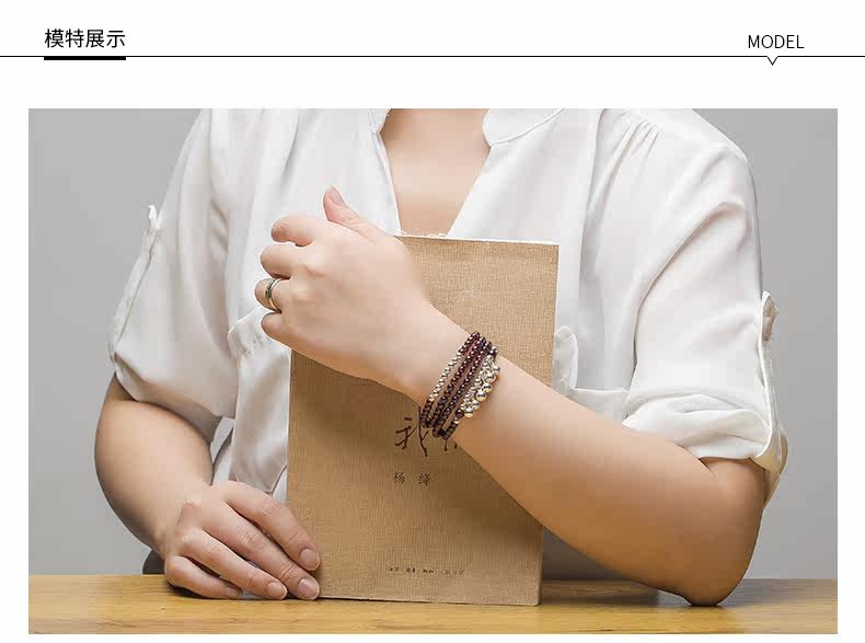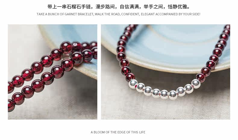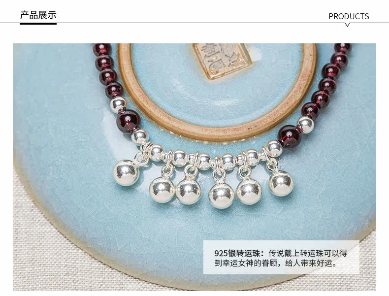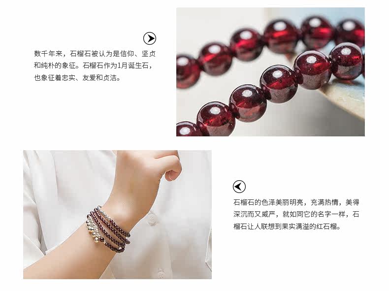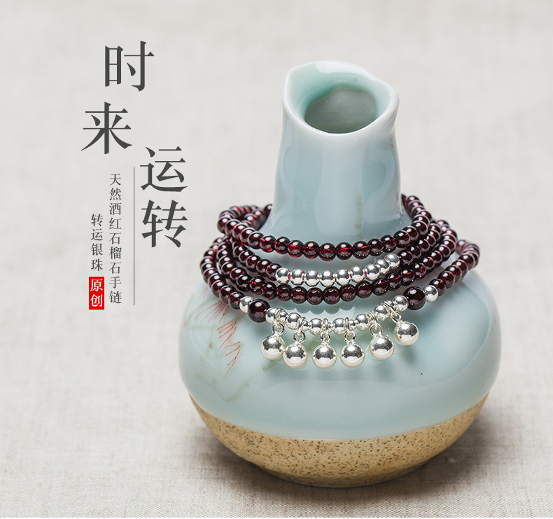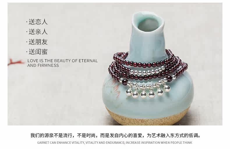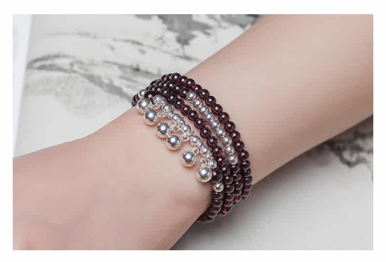 天然酒红石榴石水晶手链女多圈925银配饰手串节日礼物