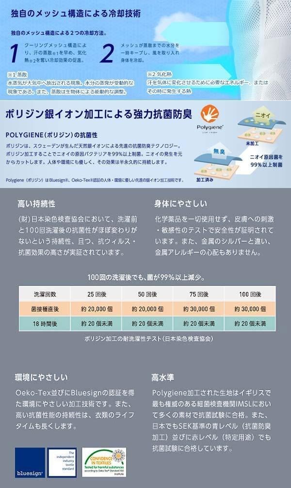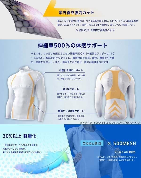 | ●ゼロフィットシリーズ夏用モデル☆独自のメッシュ構造が、汗の水分を冷却エネルギーに変え身体を冷却!! | | ●汗を素早く蒸発させ、熱を奪い冷却すると同時に、風を取り込み汗を冷やして身体を冷却します。 | | ●伸縮率は最大500%と非常に伸びが良く、動きを妨げる不快なツッパリ、べとつきがありません。 | | ●約95gと一般の機能性アンダーに比べても超軽量!! |
