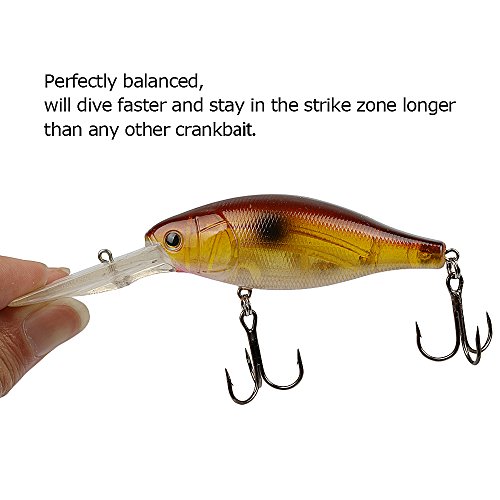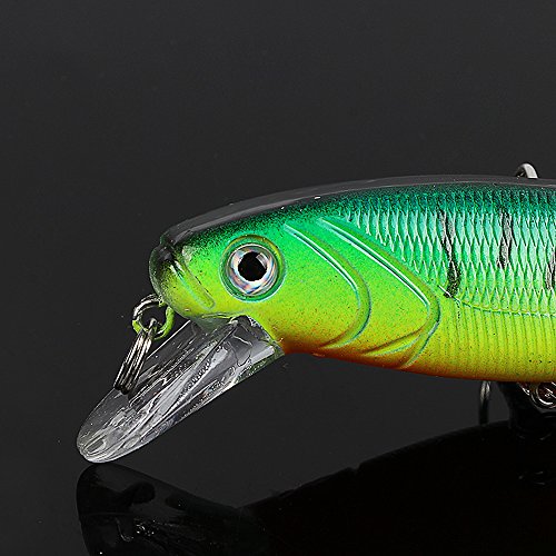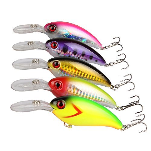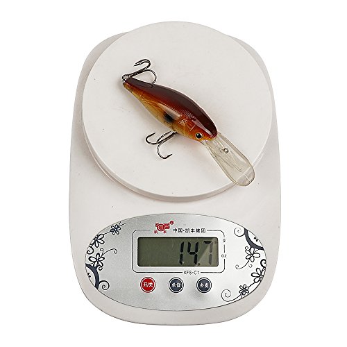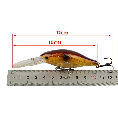 -. Feature : Fish length:4.72inch/12cm,Weight: 0.37oz/10.5g/piece,Diving Depth: 0.5m-1.5m / The bright-color minnow fishing lure with 3D eyes create life-like smooth and rapid diving action actions to attract big fishes in water. / Comes with 2 high carbon steel razor sharp treble hooks(6#). / Steel balls inside shift the center of gravity and create life-like swimming actions in water! / Package Included:5pcs in different colors,bright colors to attract big fish!