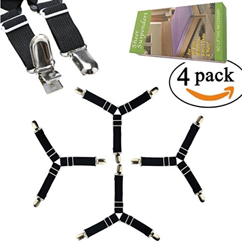 These Sheet suspenders/straps Fits with fitted sheet and flat sheet, Adjustable length allows desired tension. The newest and hottest product being used for keeping sheets tight all night long; Great For Bed Sheets and Mattress Covers; tablecloth clips; Ironing Board Cover Fasteners; fitted sheet holder,bed sheet holder straps,bed sheet corner clips grippers straps,adjustable elastic sheet straps grippers,sheet fasteners;Sheet suspenders criss cross