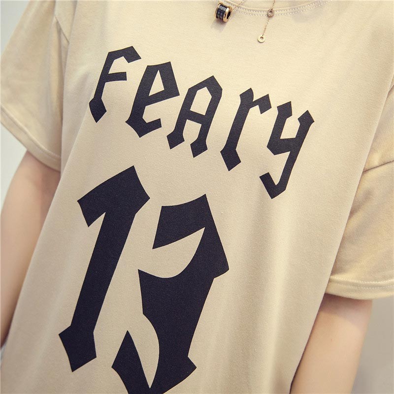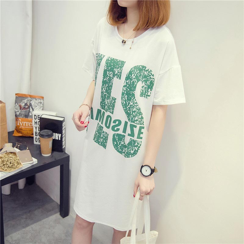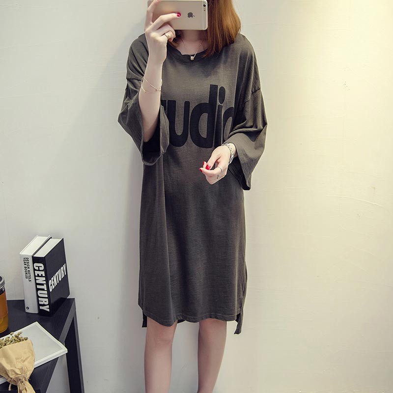 胸にイラスト入りのひざ丈5分袖のルーズフィットTシャツワンピースです♪