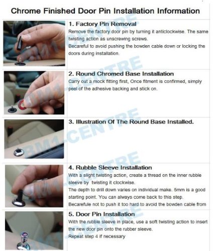 -. Feature : 1 Set x CHROMED METAL DOOR PIN FOR BMW, Fits ALL BMW, Each 44mm Length / Contents in Gift Box Set: 4 x Chrome door pin 4 x Chrome round base (with 3M tape) 4 x Rubber sleeve / Replace those dull plastic factory door pins with this lively set of door pins. These door pins are directly replacing the OE pins, simply by unscrewing the old ones out and screw on the new ones. Height is adjustable to suite your taste. It can be done by varying the depth you push in. 100% New with package ( in box ) No door panel removal is required. -. Label : LH -. Manufacturer : LH -. MPN : DP BMW M -. PackageQuantity : 4 -. PartNumber : DP BMW M -. ProductGroup : Automotive Parts and Accessories -. ProductTypeName : AUTO_ACCESSORY -. Publisher : LH -. Studio : LH -. Title : BMW M POWER CHROME DOOR PIN SET 4 pcs