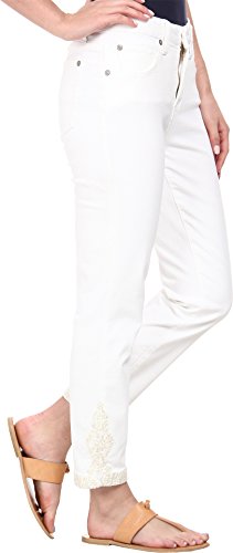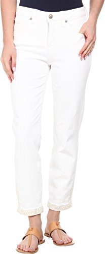 Patented hand-crafted canvas Miracle panel flattens the tummy for a trim silhouette. Contoured waistband falls about 1' below the navel. Higher back rise prevents embarrassing panty peek-a-boo. White wash has a tone-on-tone design for a textured look. Super stretch cotton-poly denim retains its shape for a polished appearance from sunup to sundown. Tonal topstitching. Belt loop waistband. Zipper fly and button closure. 89% cotton, 9% polyester, 3% spandex. Machine wash cold, tumble dry low. Imported.