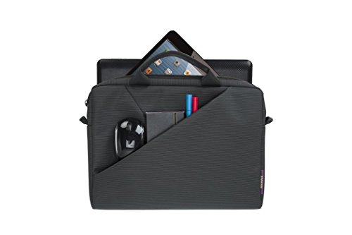 -. Feature : Slim and sturdy laptop shoulder bag, durable waterproof fabric / Protective padding on all sides of laptop compartment / Cushioned interior pouch for 10.1-inch tablets, separate section for notebooks and documents / Stylish zippered pocket, removable adjustable shoulder strap of matching color / Designed by RIVACASE, Germany