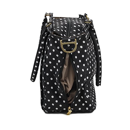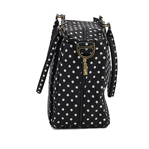 The Ju-Ju-Be Be Classy Diaper Bag is like you - a class act. You might spend a majority of your days covered in baby food, or picking up the playroom for the 100th time, but have no doubt: you are still the same classy woman you have always been and will always be. Which is why we want to thank you for the inspiration behind this bag design. Thanks to the feedback from our talented fan base we were able to create the Be Classy: a bag that is a testament to the spirit of the Pink Ladies that make Ju-Ju-Be great, and the standard to which we always strive. A bag that is not only one of our most functional, tailored designs, but also possibly the most timeless. With its sleek design and adjustable messenger strap or structured handbag style carrying options, the Be Classy is the perfect culmination of your favorite Ju-Ju-Be features. A bag so functional you will bring it on your first outing with your newborn, and one so elegant you will carry it well after the diapering days are done. The light colored lining is protected with an Agion natural antimicrobial treatment that inhibits and reduces the growth of odor-causing bacteria, mold and mildew. The outer fabric is treated with Teflon fabric protector, making it easy to repel stains. The front "mommy" pocket holds keys with a stretch key fob and sunglasses (cleans lenses too.) with plenty of room for more. The main zipper pocket is large enough for diapers, wipes, extra clothes and other items. Keep organized inside with (3) gusseted pockets and (1) zippered pocket. The back pocket is designed with crumb drains to keep this area clean and includes a super cushy memory foam changing pad. The (2) bottle pockets are located on either side of the bag and insulated with Thinsulate to keep items warm or cold. The structured bag is accented by metal hardware, including luggage feet to keep the bottom of your bag clean when you set it down. This bag is machine washable and measures 13.38-inches by 11-inches by 6.5-inches.Feature