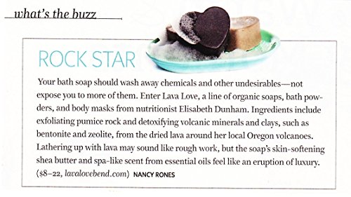 As seen in Yoga Journal; Made with three types of lava from Oregon volcanos - bentonite, zeolite and pumice - gently exfoliates skin with a light, Central Oregon scent