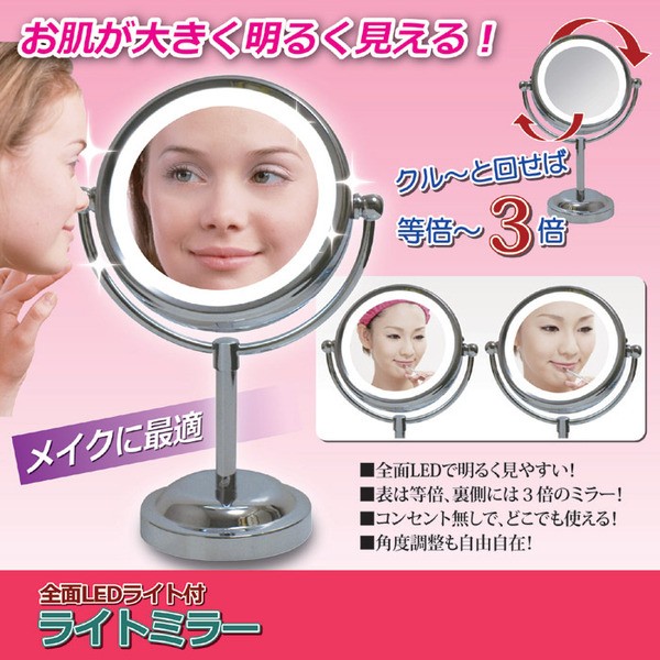 メイクに欠かせない卓上ミラーが使いやすく明るくなりました。角度が自由に変えることができるのはもちろん、表面は等倍率のミラーで、クルっと裏側へ回せば3倍率のミラーで見ることができます。細かな部分のメイクにはこの3倍率ミラーが欠かせません。また、お肌を明るくハッキリ見えるように、鏡の周囲にはサークル型のLEDライトを装備しました。電源は乾電池式なので、コンセントが無くても持ち運んで使用できます。