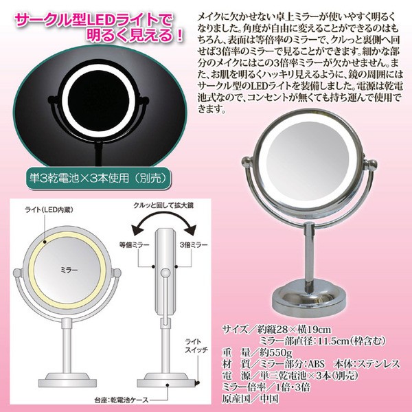 【商品名】LEDライト付き卓上ミラー 丸型 乾電池式ライト 角度調整可