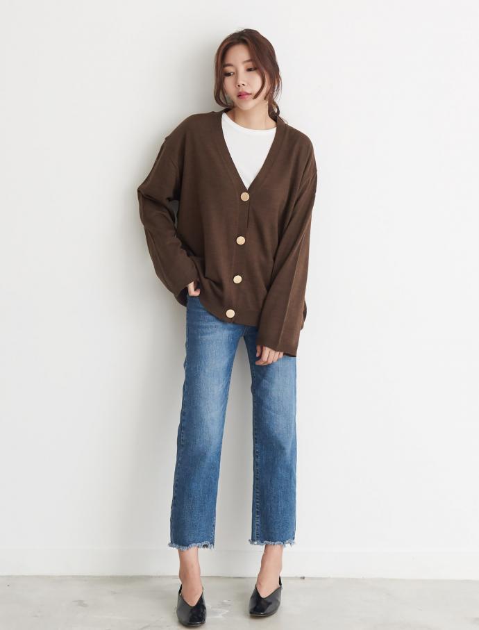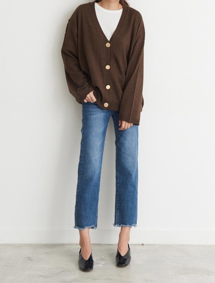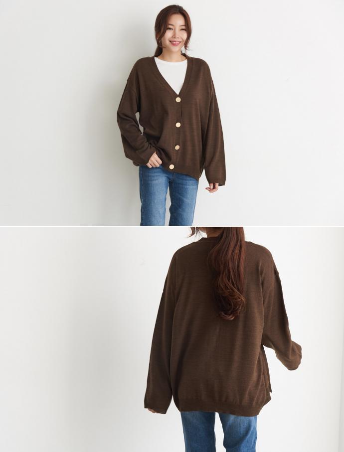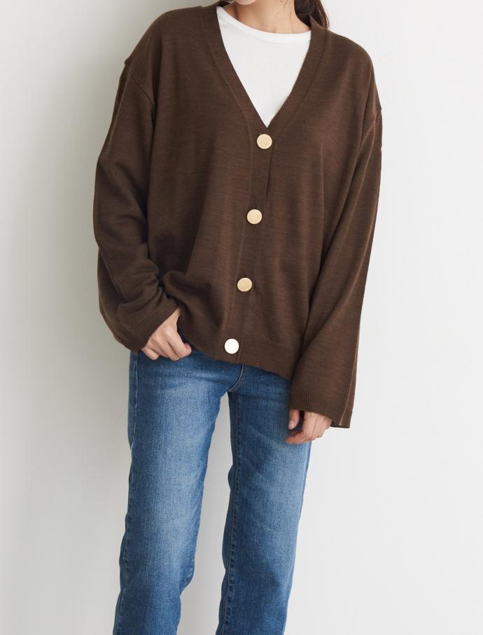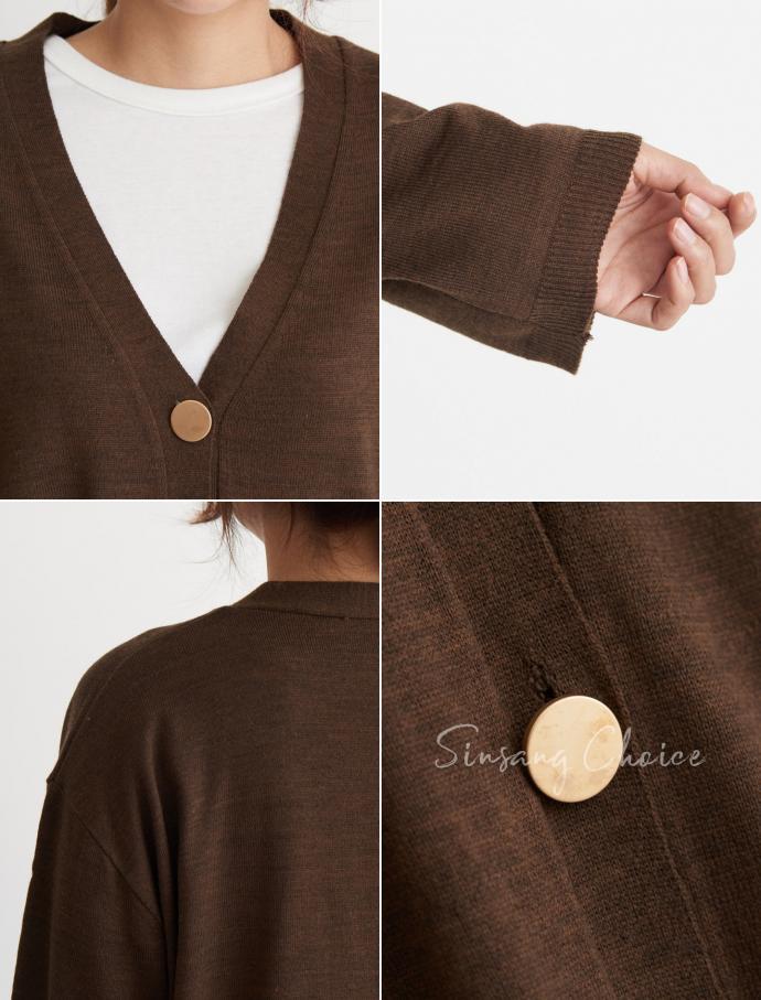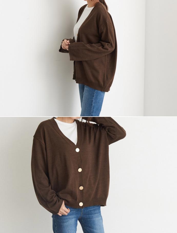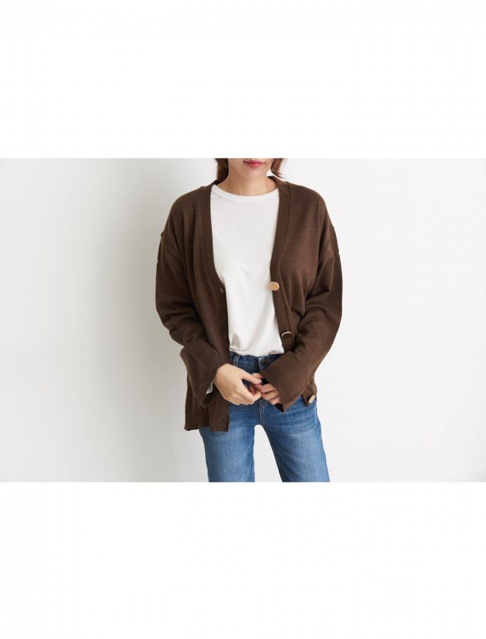 Simple wood button Y-neck knit cardigan Date coordination Soft material Stylish color Basic