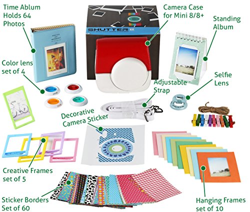 Most Fun and Exciting Fujifilm Instax Mini 8/8+ Instant Camera Accessories Kit!Shutter brings you a great 11 piece camera accessories bundle set for the Fujifilm Instax Mini 8/8+ Instant Camera. We help you get the most use and fun out of your Fujifilm Instant Camera.