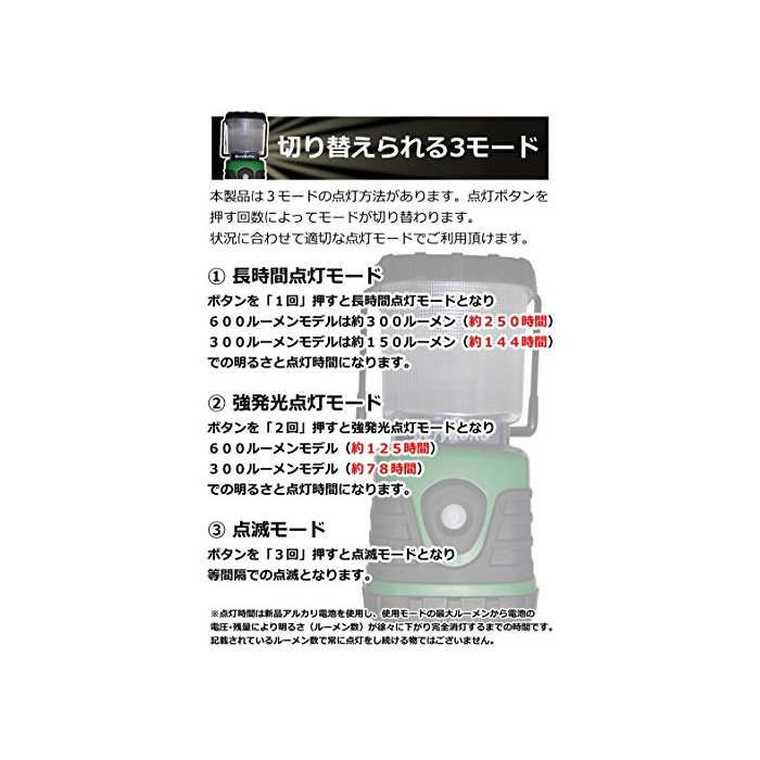 【모드 교환】 강발광 점등 모드(약125시간※) / 장시간 점등 모드(약250시간※) / 점멸 모드의 3모드 탑재 ※점등 시간은 알카리 전지를 사용하여 최대600루멘(장시간 모드는 300루멘)부터 전지의 전압?잔분량에 의해 밝기(루멘수)가 서서히 샅바에 드리우는 수술 같은 장식 완전 소등하기 까지의 시간입니다.