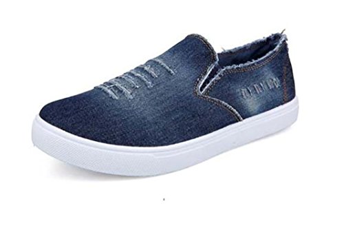 -. Feature : 【素材】 : [アッパー] キャンバス [ソール] 合成樹脂  【サイズ】 : 26cm / 42 ・ 26.5cm / 43  【色】 : ネイビーブルー / 旬の色落ち、クラッシュ、ダメージ加工が斬新な「上質デニムスリッポンスニーカー」。「通気性」と「耐久性」を兼ね備えた「上質デニム素材」を使用。「薄過ぎず」「厚過ぎない」「1年中着回せる丁度良い厚み」にもこだわりました。 / 「ダメージ加工」は「前面、両側面」に施しました。更に「履き口」にも「カットオフ(切りっぱなし)加工」を施し抜群の風合い。少し「派手目」にダメージ演出することによって、足元でも「存在感を主張」できるアイテムに仕上がりました。 / ボディー自体は軽量化されていて、ソフトで柔らか。インソールにはソフトクッションが内蔵、負荷ゼロの快適な履き心地です。シルエットはややスリム、「スリッポンだけどスマートでスタイリッシュ」なフォルムに。 / 上質な色落ち加工にこだわったデニムスリッポンなのでシンプルなコーデに追加するだけで正に「大人ストリート」の艶。コーディネートのアクセントに最適です。ストリート、カジュアル、フォーマル、スポーツ、セレブ、サーフ系、どんなファッションやシーンにもピッタリ合わせられる優秀さも魅力です。