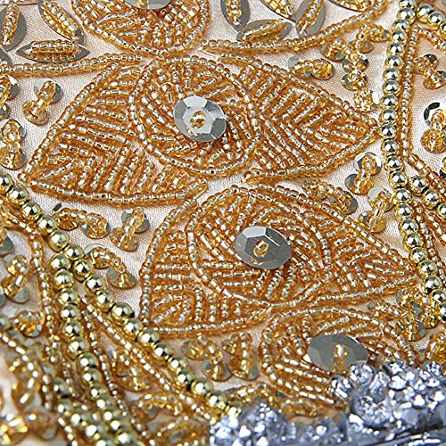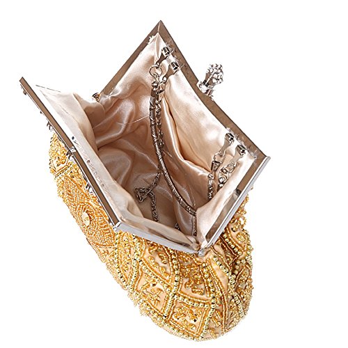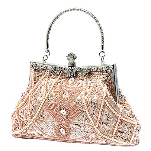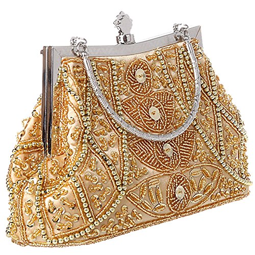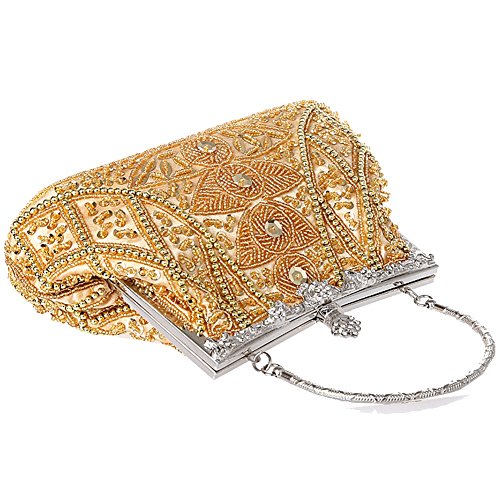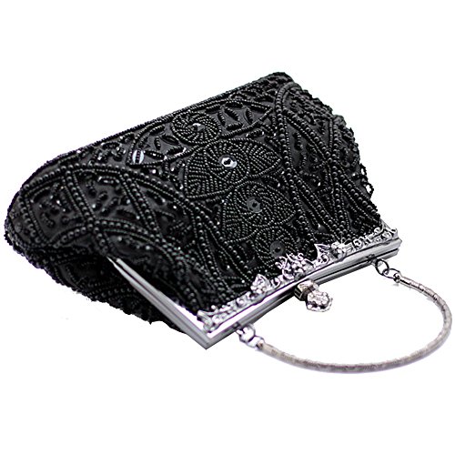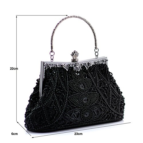 -. Feature : Made of high-quality satin, beading and sequins / Handmade Beaded Bag Size: 9.05inch * 2.36inch * 8.66inch (L*W*H) / Unique pattern made of beads and sequins. Spacious enough to fit all your essentials in it. / Metal Frame, Removable chain strap, kissing lock clasp keeps your item safe / Gorgeous handmade clutch for women, perfectly for evening, wedding, cocktail birthday, night out and other formal parties.