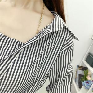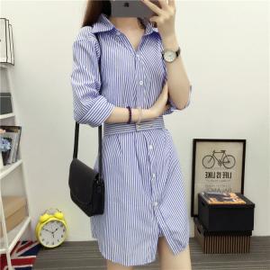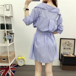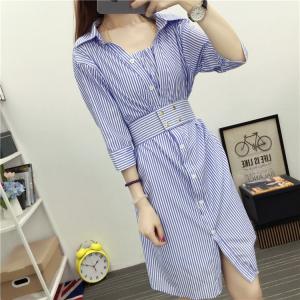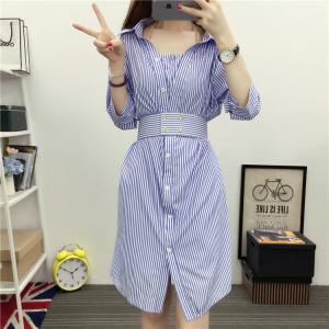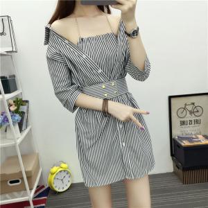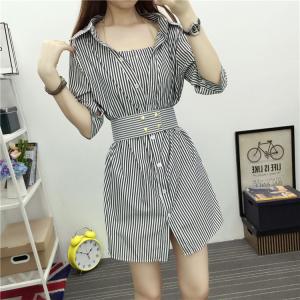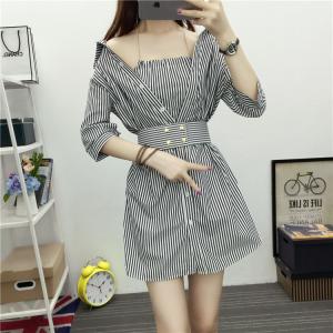 シャツワンピース ストライプ ミニ丈ワンピ ウエストベルト 抜け襟 長袖 ツーピース ボリューム袖 春夏