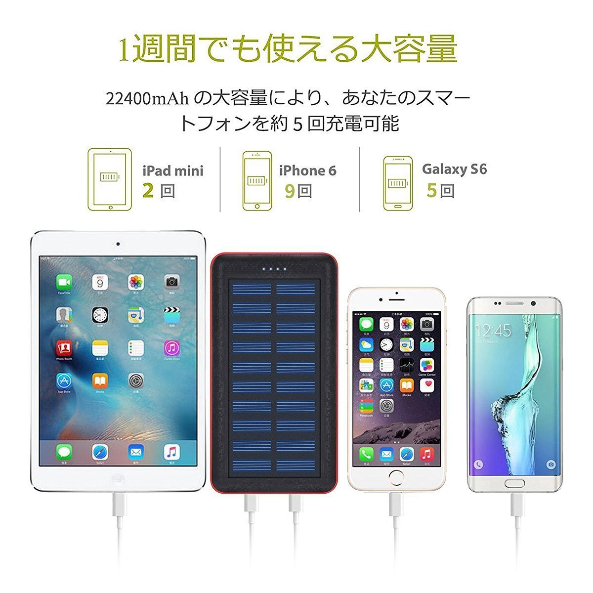 22400 mAh Since it is super large capacity, it can charge many times with one charge, eliminate the battery run out when going out.