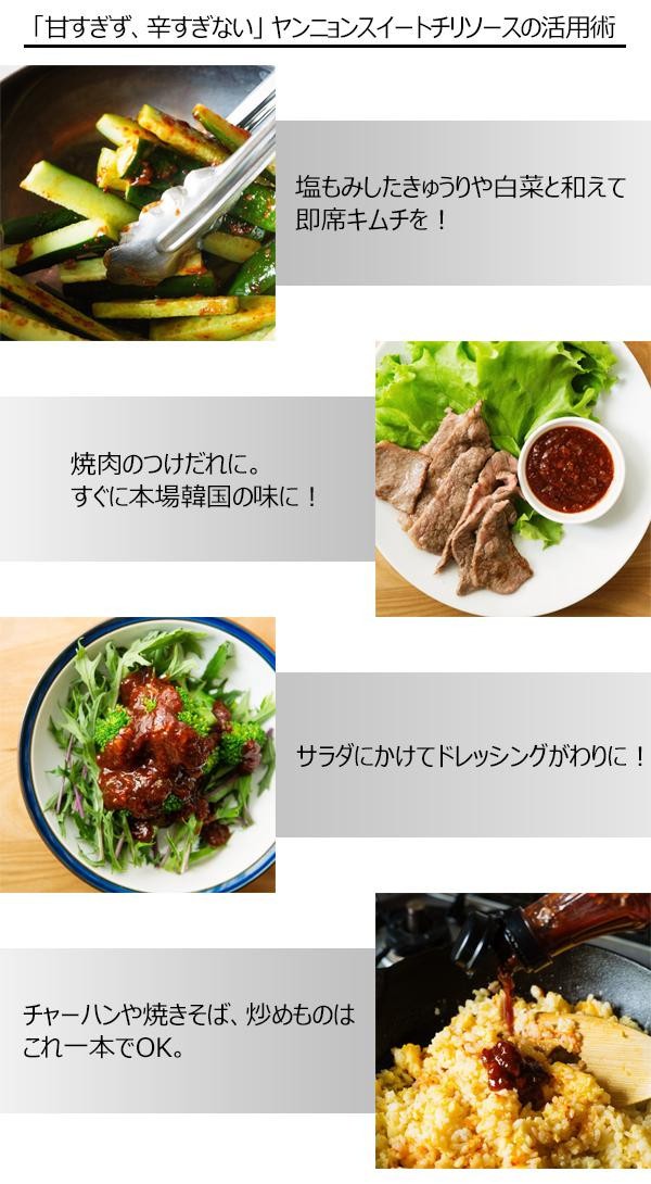 | 昆布だしをベースにした韓国万能調味料。ヤンニョンとは、韓国の家庭に欠かせない伝統的な合わせ調味料の総称です。各家庭によって、調合も味も違います。トレテスの「プンミヤンニョンスイートチリソース」は、韓国料理研究家の崔誠恩(チェ・ソンウン)さん秘伝調合のヤンニョンを使用しています。天然の昆布だしと秘伝のヤンニョンをベースに、魚介、果物、野菜をじっくりと煮込み、丹念に仕上げました。 |