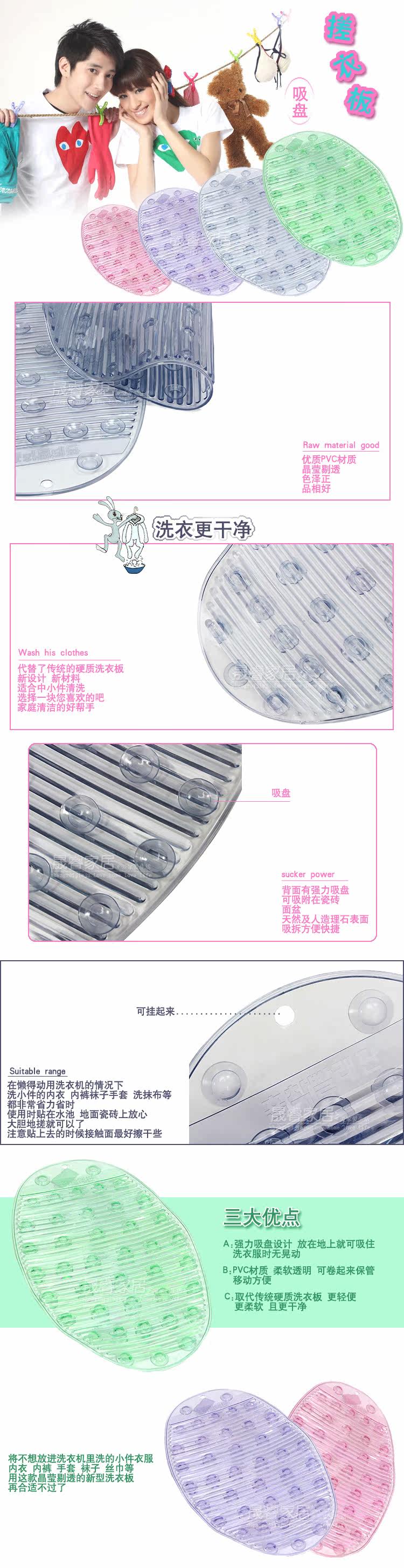This product uses pvc material? very wearable. There are a lot of suckers at the bottom? you can suck firmly on the tile? glass. Head a hook hole? you can hang dry? easy collection. In the case of too lazy to use the washing machine? washing small pieces? wash cloths? are very saving time. When using the pool stick? floor tiles safely rub on it? the back of strong sucker? can be adsorbed on the tile. Vanities of natural and artificial marble surface? suction split convenient for the Small parts cleaning. Choose one of your favorite bar? household cleaning good helper