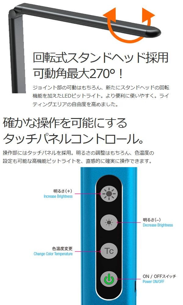スタンドヘッドに回転機構を採用し、最大270度の可動範囲で広範なライティングが可能です。