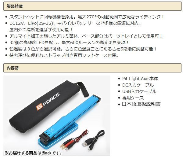 スタンドヘッドに回転機構を採用し、最大270度の可動範囲で広範なライティングが可能です。 製造国:中国 素材・材質:金属、樹脂 商品サイズ:281×60×314.5mm 重量:460g セット内容:Pit Light Axis本体DC入力ケーブルUSB入力ケーブル専用ケース日本語取扱説明書 ※サプライヤー直送品 ご注文後2~3営業日後の出荷となります【商品名】G-FORCE ジーフォース Pit Light AXIS(Black) G0189