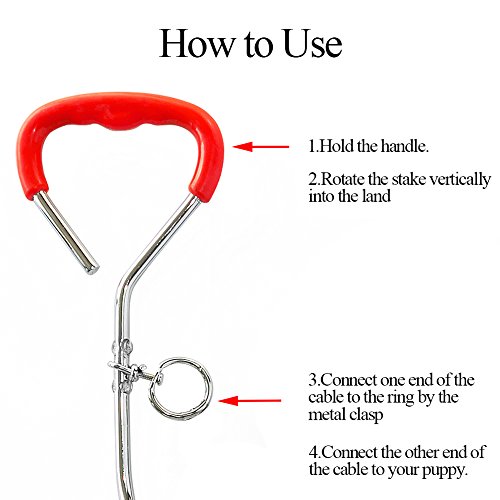 Easy to install Firstly, screw the 16in stake into the earth and make sure that it is firmly secure. Secondly, attach the clip at one end of the steel cable to the spiral stake. Thirdly, attach the clip at the other end of the cable to your dog's or cat's collar, Finally, make sure that your pet is safe when you are using this tie-out stake and cable.