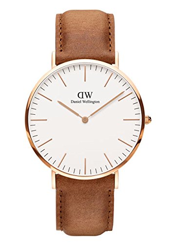 Stainless steel case with a brown leather strap. Fixed rose gold-tone bezel. White dial with rose gold-tone hands and index hour markers. Minute markers around the outer rim. Dial Type: Analog. Quartz movement. Scratch resistant mineral crystal. Pull / push crown. Solid case back. Case size: 41 mm. Case thickness: 6.5 mm. Round case shape. Band width: 20 mm. Tang clasp. Water resistant at 30 meters / 100 feet. Functions: hour, minute, second. Casual watch style. Item Variations: DW00100109. Daniel Wellington Durham White Dial Mens Watch DW00100109.Feature