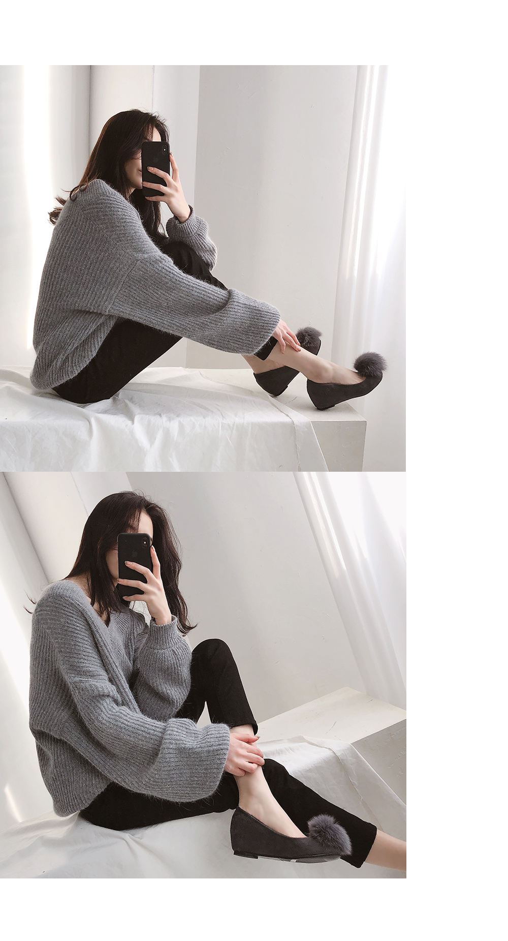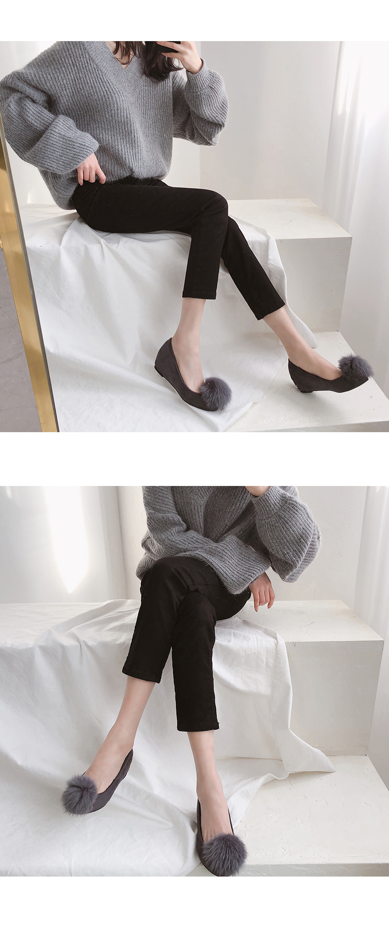 DETAILS - 소재 : 인조스웨이드 인조퍼 - 컬러 : gray,black - 안감 : 전체기모 - 피팅감 : 정사이즈 / 무게 : 보통인편 - 착화감 : 편해서 데일리 슈즈로 좋아요 - 모델피팅 : 235