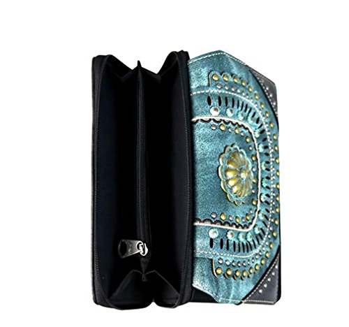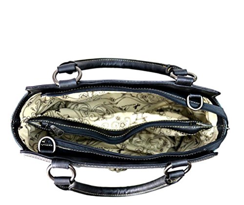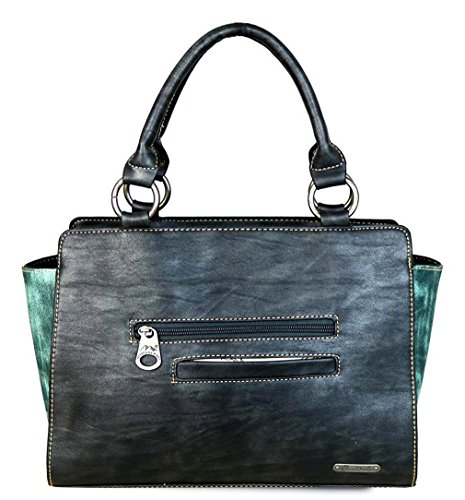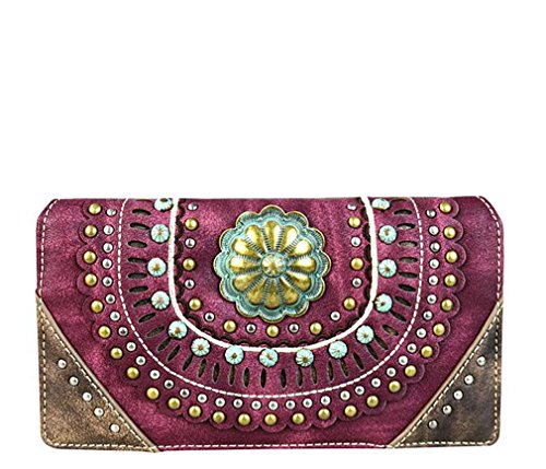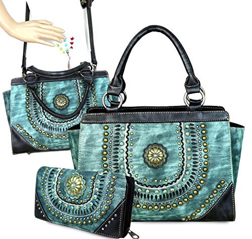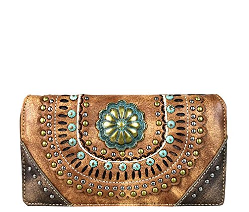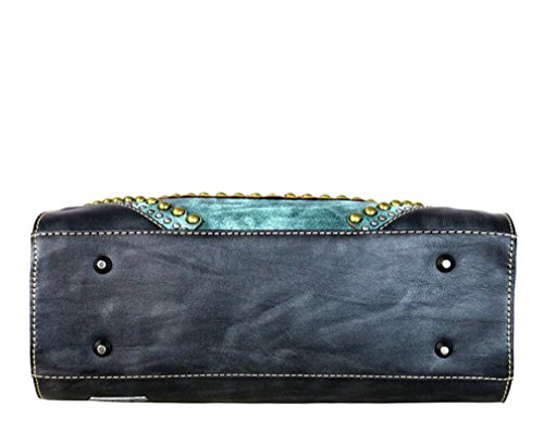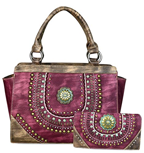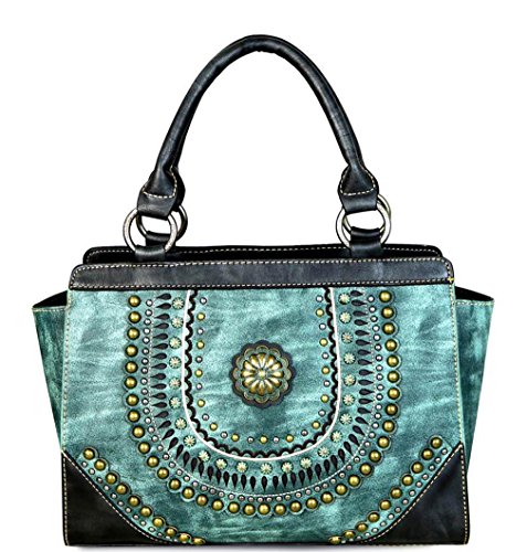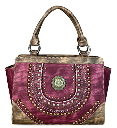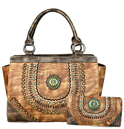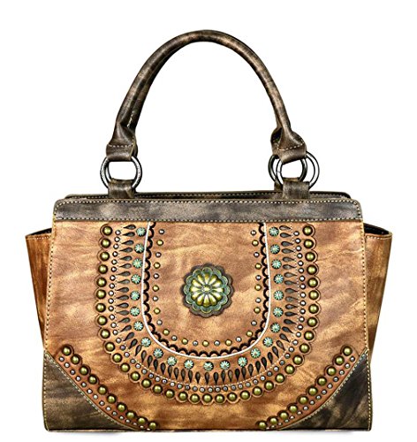 ? Scalloped trim on the flap with magnetic closure ? Accented with patina gold concho outlined with faux leather cut-out detail ? Layered with gold, silver, patina studs ? An open pocket and zippered pocket on the back ? Metal feet on the bottom for protection and stability ? Double handles ? Adjustable, detachable crossbody strap included (Length: 44", Drop 21 )