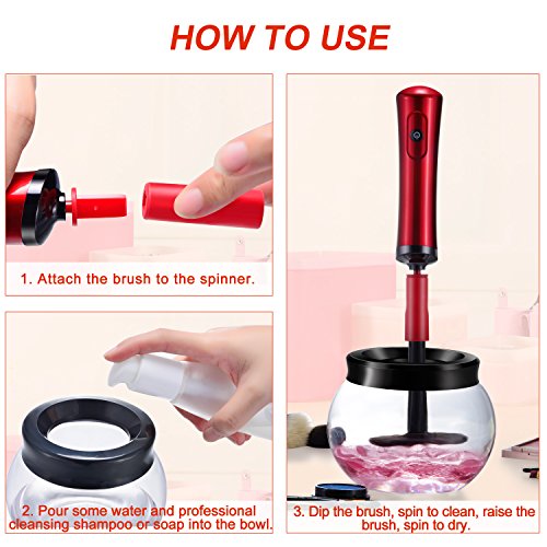 - ✔EASY TO USE - Just three quick steps to clean makeup brushes. 1. Attach the brush to the spinner. 2. Pour some water and professional cleansing shampoo or soap into the bowl. 3. Dip the brush, spin to clean, raise the brush, spin to dry.