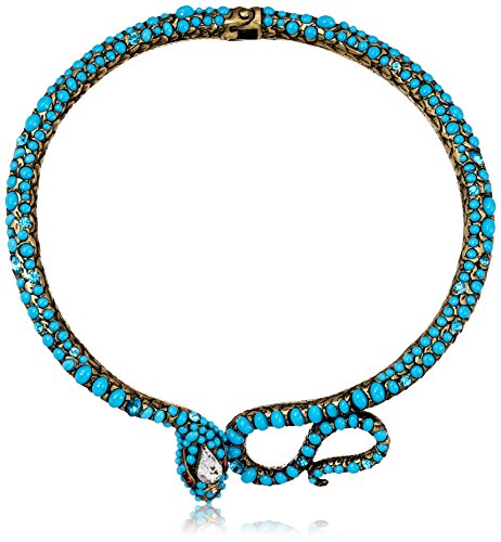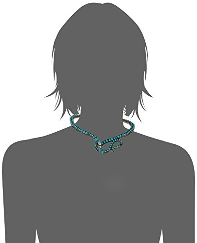 gold tone snake collar necklace featuring small cabochon turquoise stones with pops of blue faceted stones, pink stones and a large crystal teardrop stone