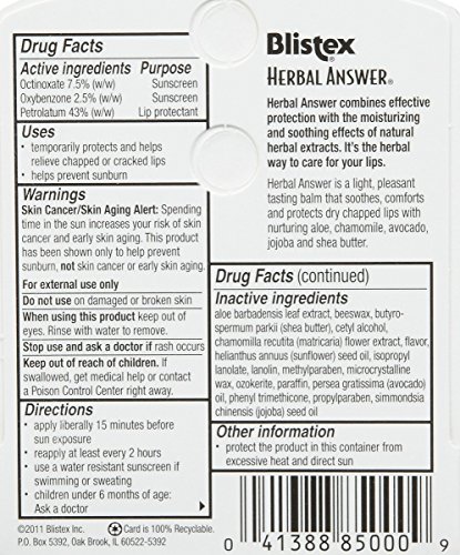 Blistex Herbal Answer Lip Balm SPF 15Herbal Answer combines effective protection with the moisturizing and soothing effects of natural herbal extracts.