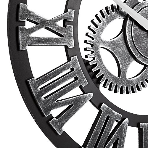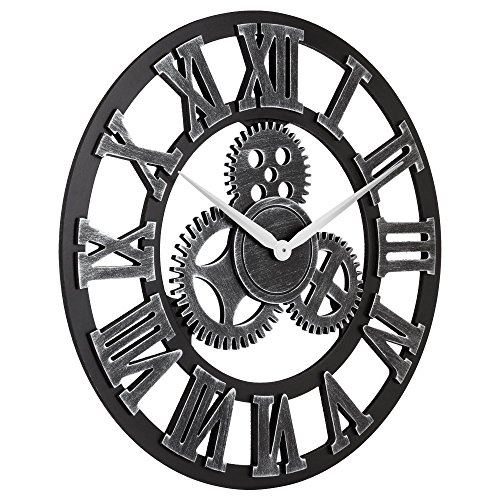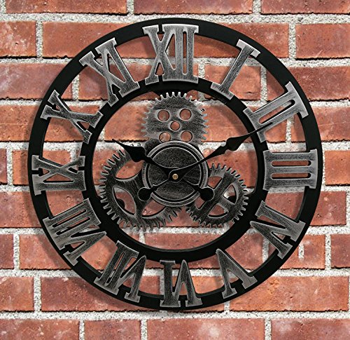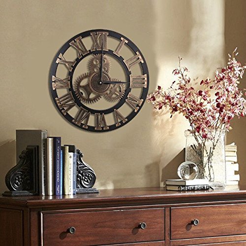 -. Title : Roman Numeral Wall Clock, Eruner Industrial Large Decorative 3D Gear Wooden Clock Silent Non-ticking European Retro for Kitchen Living Room Cafe Restaurant Decor, Gold Silver