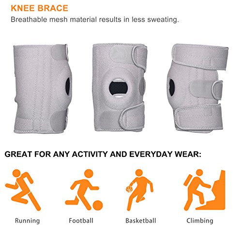 -. Feature : Application: One size of 7.5" width fits 13.5" - 21.5" knee circumferences (Please refer to the picture on how to measure and measure 8cm above the knee). Feature with an open patella design, bilateral hinges for support, this brace is extremely durable for intense workouts/activities. / High quality: Breathable mesh lining material is adopted which features high ventilation, comfort and durability. New mesh design allows your skin breath and resulting in less sweating, easy to put on and perfect for longtime wearing. / Flexible design: Non-slip silicone strips prevent slipping; keep the brace in place all day. Designed with THREE adjustable Velcro closures which make sure the brace conforms and adapts to your size and shape. Insert high quality and lightweight metal sP.R.Ings (4 in total) stabilize in dual side for strengthening, helping with relieving knee pain. / Best accessory: Assist with preventing knee instability, hyperextension, joint discomfort and relieving tend on injuries, meniscus pain and injuries. Great for walking, running, jogging, hiking, climbing, sports and other gym workouts. / Satisfaction: See 'Special Offers' section and save more on multi-items purchase, visit our store by clicking the blue Fullmosa logo for more product options. We are dedicated to providing our customers with the best quality products. If you are not satisfied for any reason please contact us via Buyer Message directly.